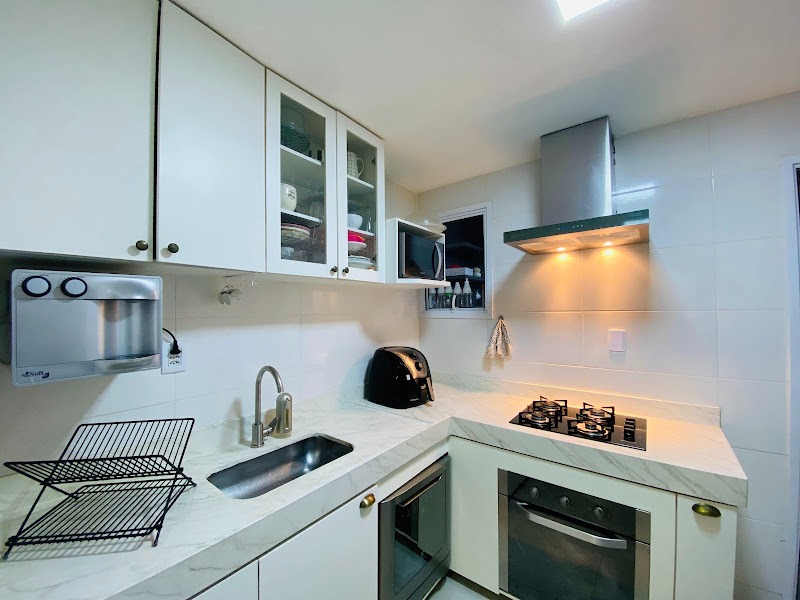 - 01 Cozinha arejada revestida ate o teto com armários planejados;