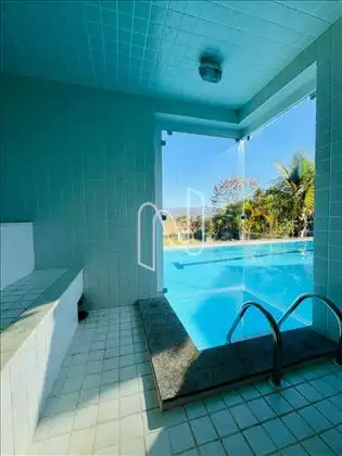 Aos fundos da casa temos a piscina com borda infinita e uma sauna que sai dentro da piscina. Além de ter um espaço aberto em volta da piscina.