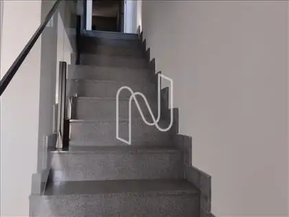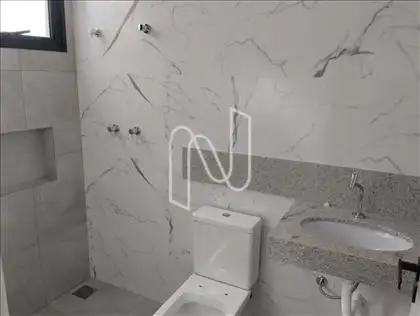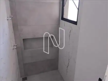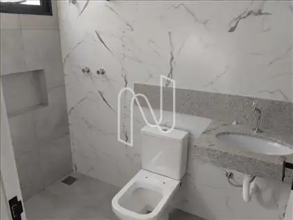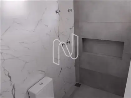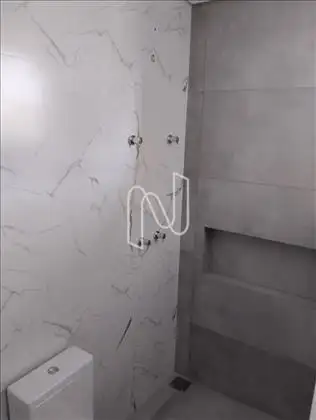 - 1 Banheiro Social granito cinza e porcelanato mármore branco e grandes nichos nos box.