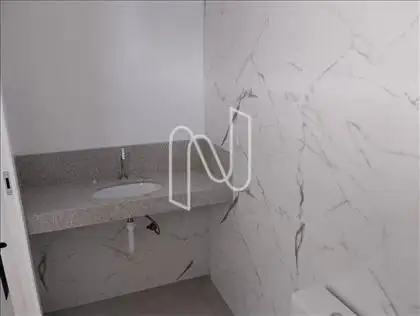 - Sala de estar com lavado adjacente com revestimento em porcelanato mármore até o teto e pia em granito cinza claro;