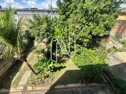 Quintal com árvores frutíferas, galinheiro e espaço para várias vagas de garagem.